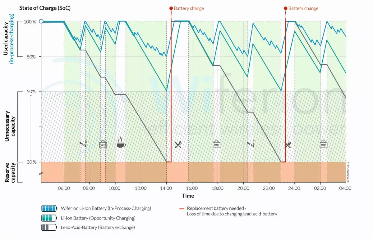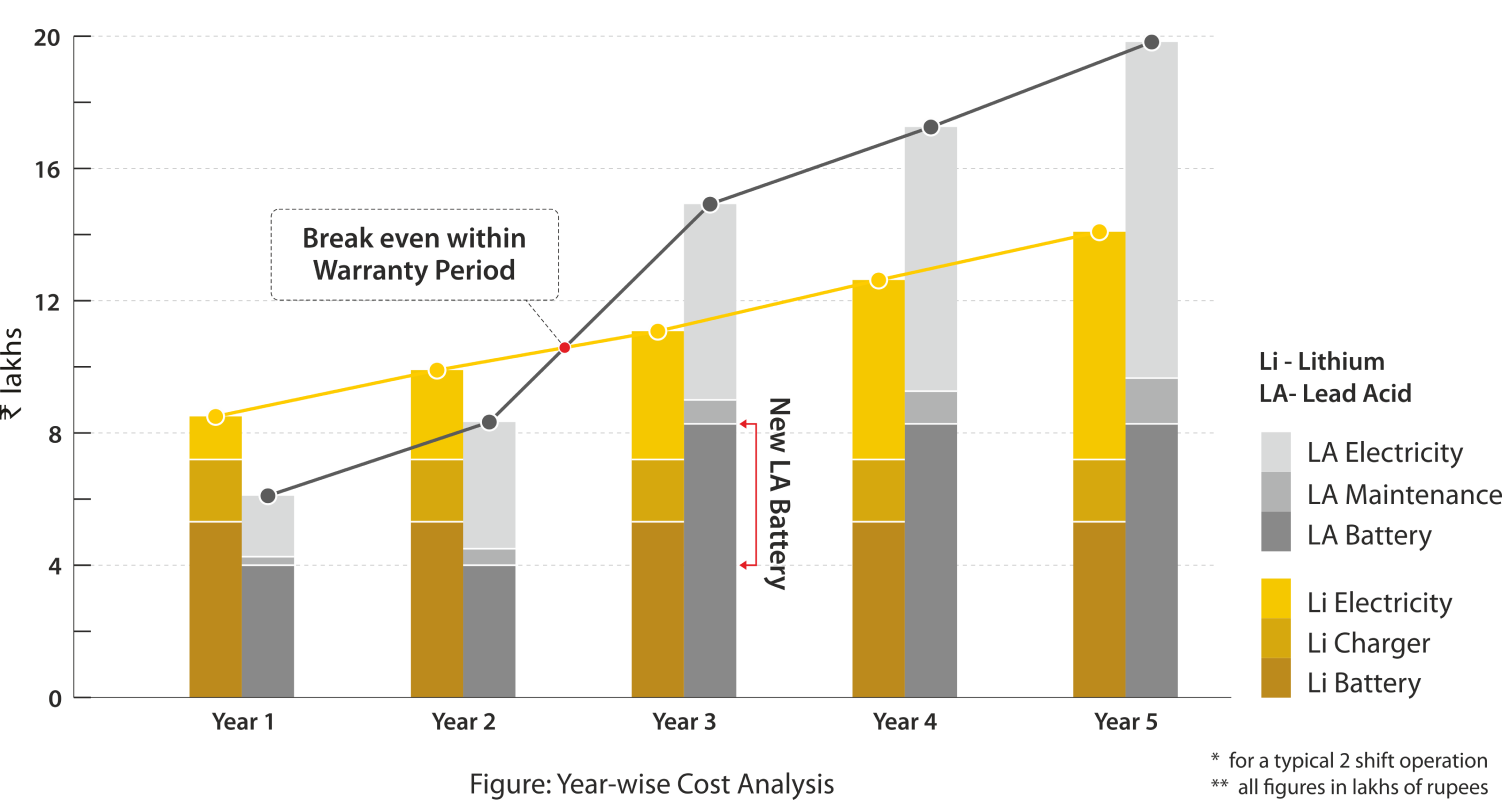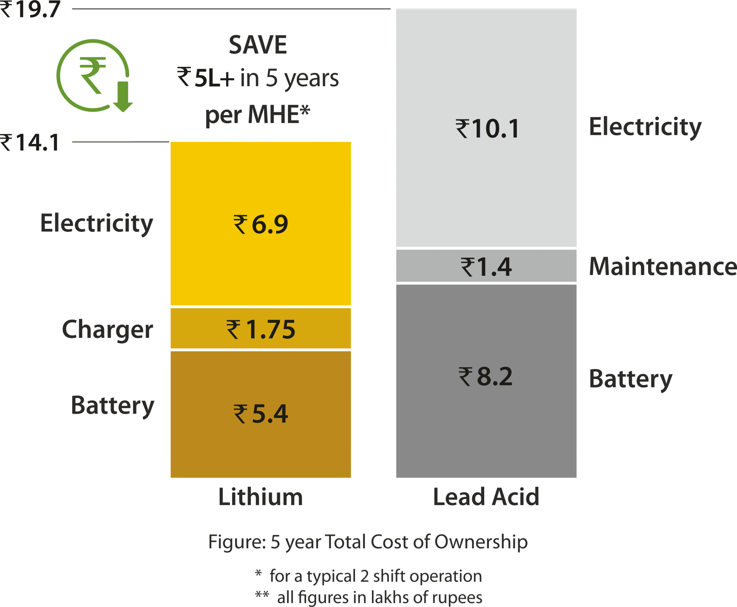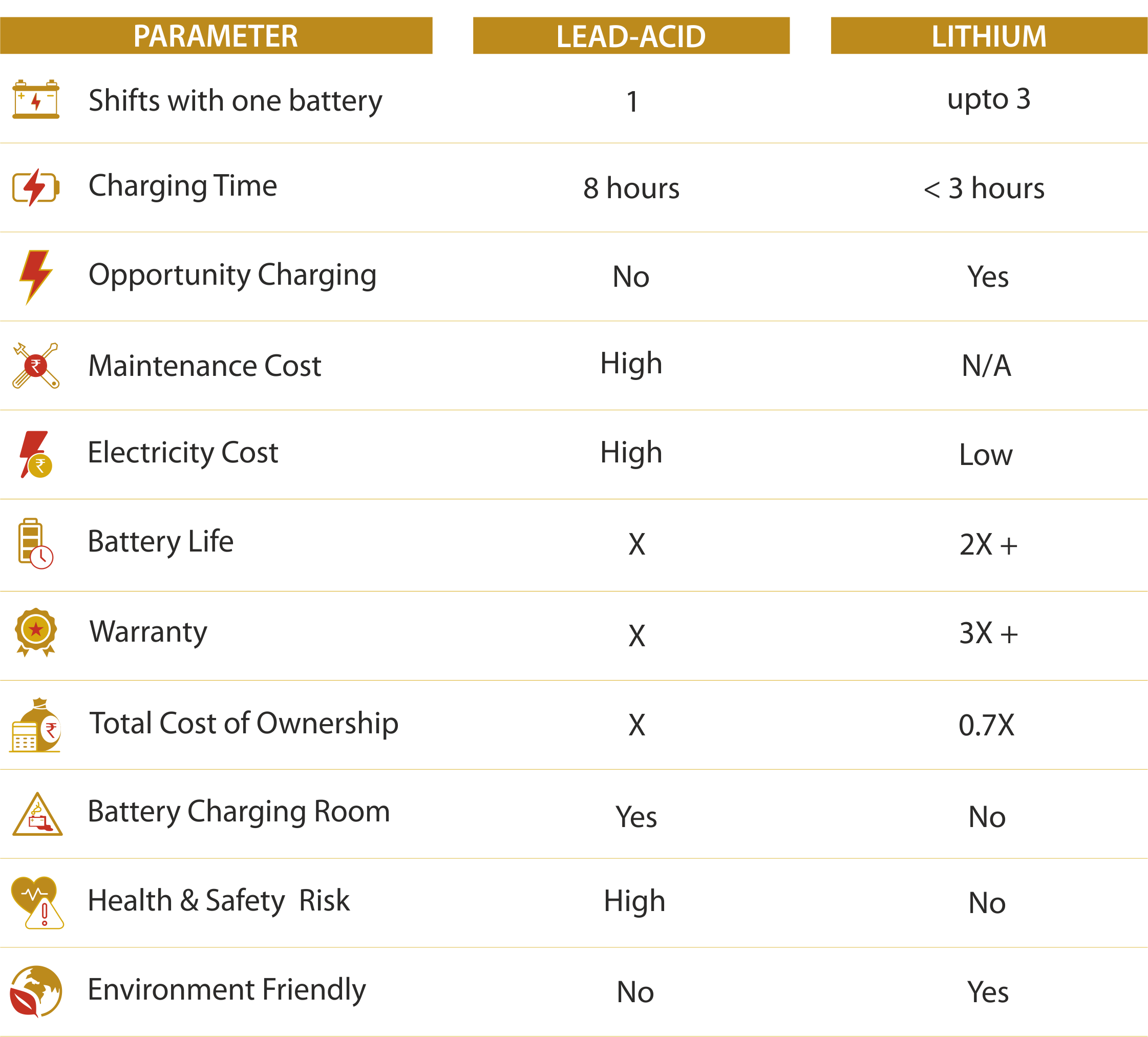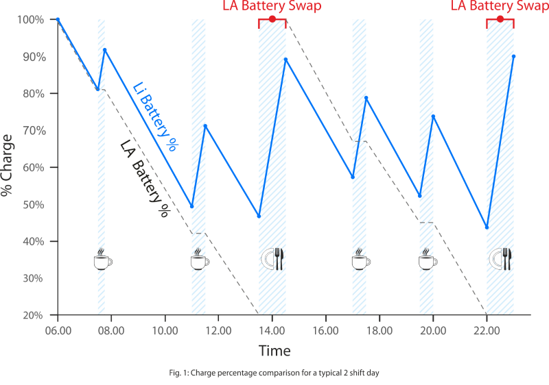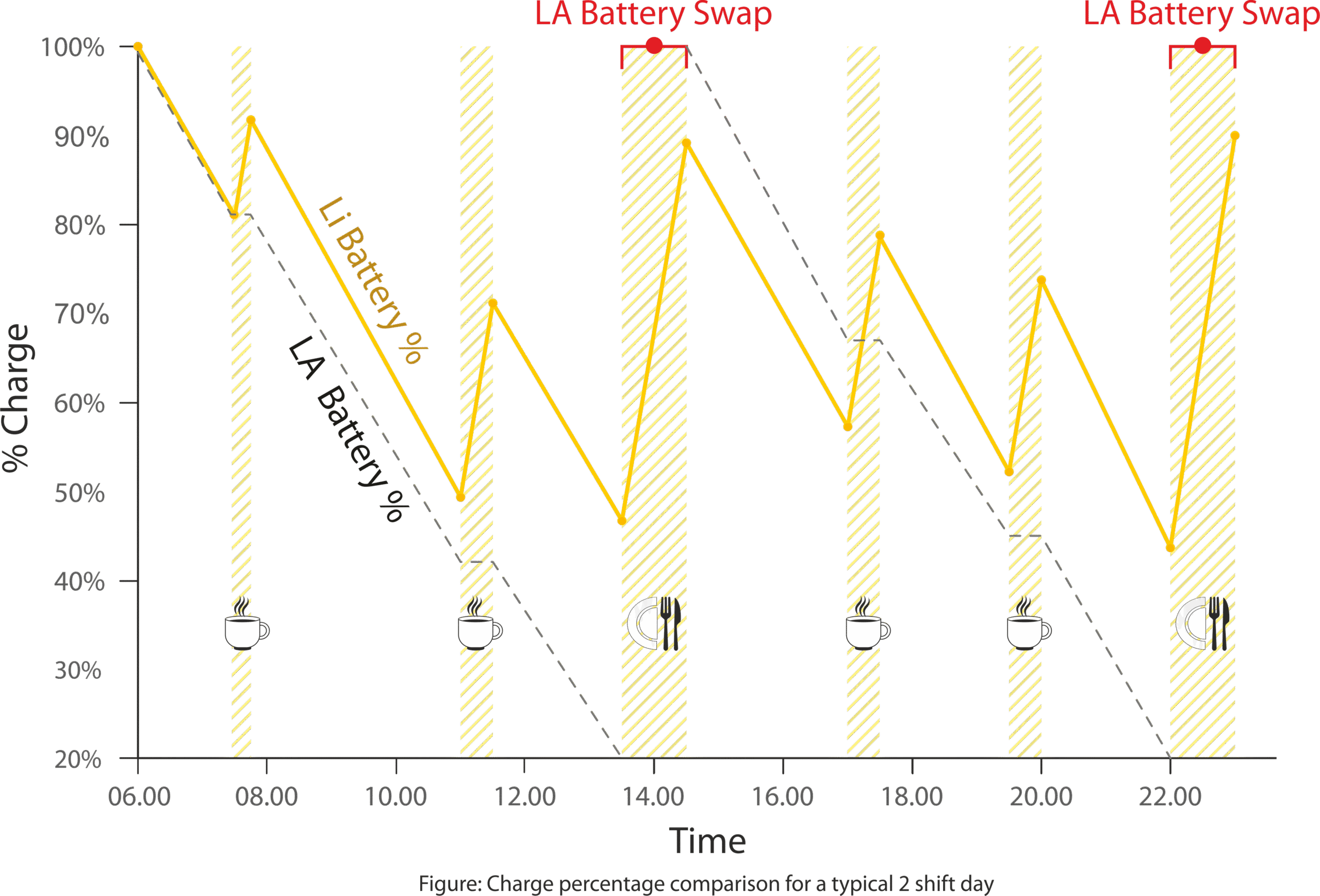 Save up to 40% cost by using lithium batteries lasting over 3 times the life of lead-acid. Opportunity charging means you don’t need spare batteries or charging room