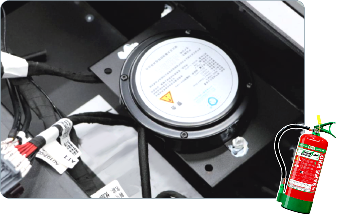 Our lithium-ion batteries are engineered with an advanced built-in re suppression system, designed to activate in the event of an external re. This innovation signicantly enhances safety by preventing the battery from igniting and helping to contain the spread of potential damage. Additionally, our batteries are constructed using premium-grade cells and high-quality materials, which drastically reduce the risk of internal thermal events, making internal res virtually impossible.