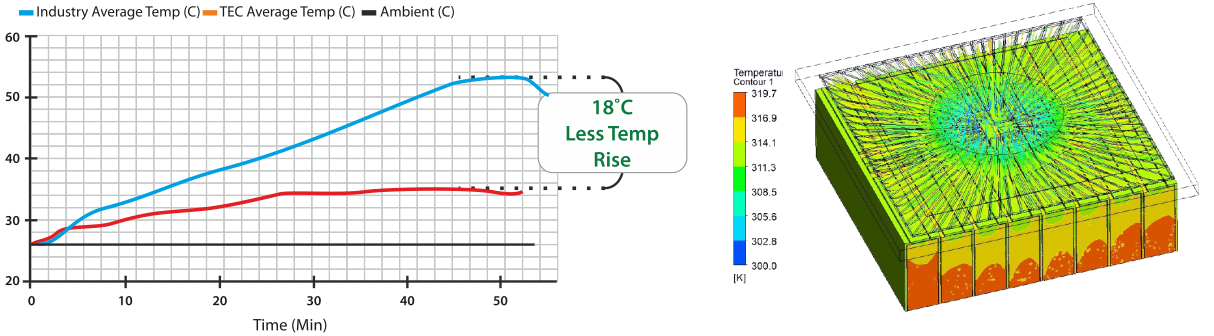 Battery built TEC technology is able to reduce temp rise by 10˚C in comparison to battery built using conventional cell to pack technology